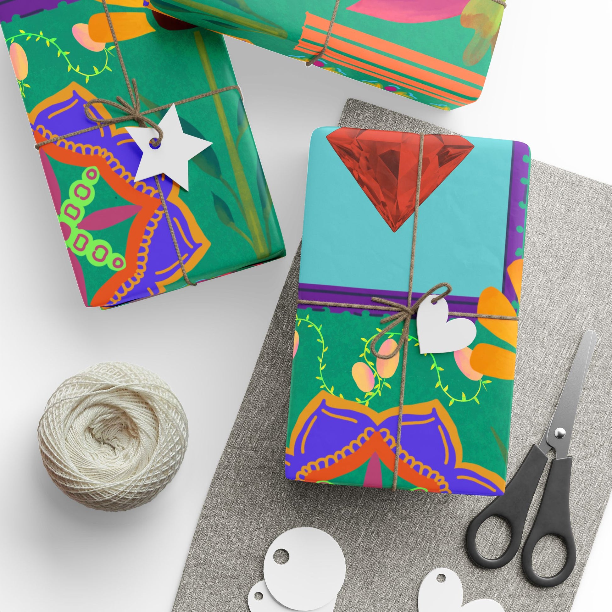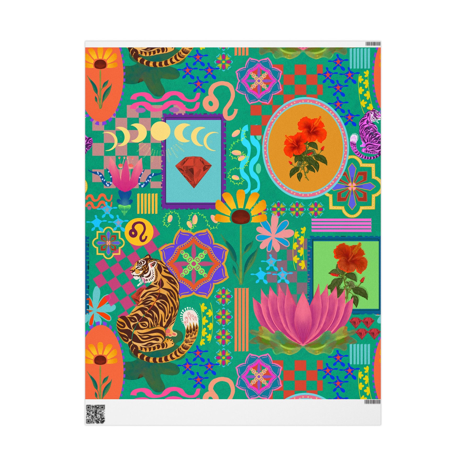 This vibrant wrapping paper design features symbolic elements like hand-drawn tigers for strength, blooming lotuses for serenity, and subtle Leo zodiac motifs Perfect for astrology lovers or those who appreciate bold, creative expression Ideal for birthdays, special occasions, or unique gifts that deserve a memorable presentation