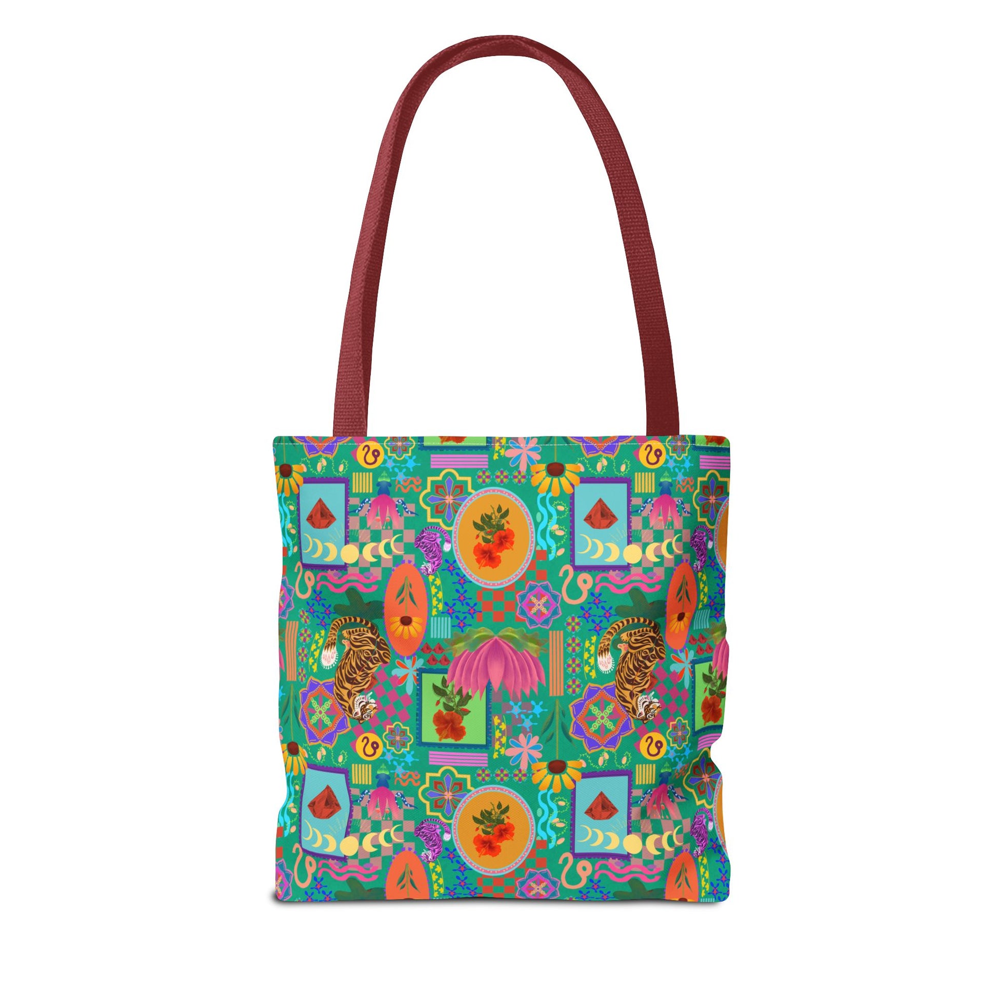 Tote Bag featuring Laxoanj Signature Print, Bold Self-Expression, Tiger Lotus Hibiscus Moon Mandala, Vibrant Colorful Bag, Wearable Art,